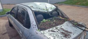 O galho caiu durante uma rápida chuva que atingiu a região do Bosque dos Jequitibás nesta tarde. O veículo, um Corsa sedan, foi atingido na parte traseira. O teto carro ficou amassado e o vidro se quebrou. Por sorte, não havia ocupantes no banco traseiro.