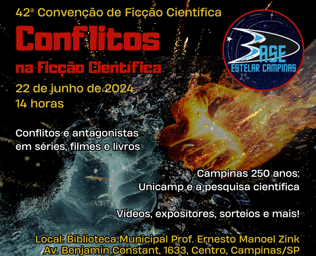 A Base Estelar Campinas realiza a 42ª Convenção de Ficção Científica neste sábado (22), às 14h, na Biblioteca Pública Municipal Professor Ernesto Manoel Zink (Benjamin Constant, 1633, Centro, Campinas). O tema da convenção é Conflitos na Ficção Científica, com a proposta de analisar e discutir como as histórias desse gênero lidam com as guerras e seus antagonistas.