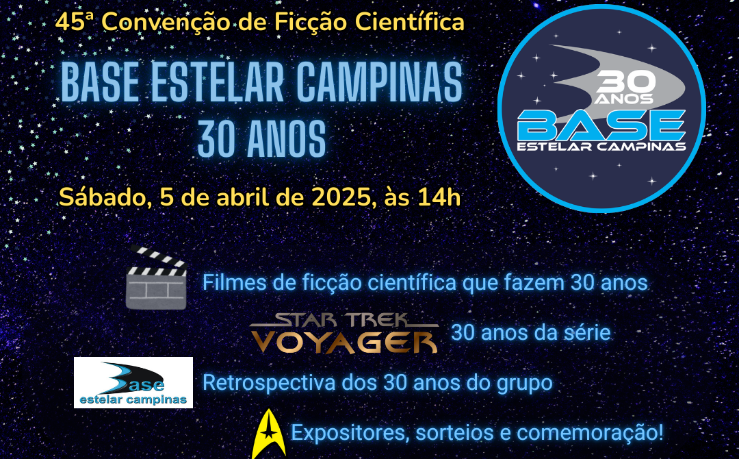 A Base Estelar Campinas celebra três décadas de existência com a 45ª Convenção de Ficção Científica no dia 5 de abril, sábado, a partir das 14h, na Biblioteca Pública Municipal Professor Ernesto Manoel Zink. O evento, gratuito e aberto ao público, contará com palestras, bate-papos e exposições sobre o universo da ficção científica.