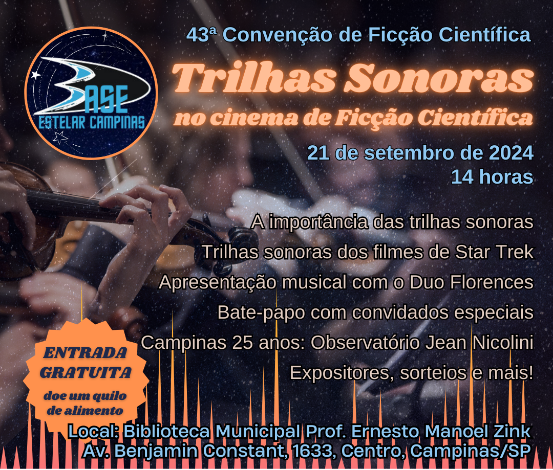 A Base Estelar Campinas realiza neste sábado (21) sua 43ª Convenção de Ficção Científica, às 14h, na Biblioteca Pública Municipal Professor Ernesto Manoel Zink, no Centro. O tema da convenção é “Trilhas Sonoras no Cinema de Ficção Científica”. A programação terá também uma apresentação da série Campinas 250 anos: ciência e tecnologia, em comemoração ao aniversário da cidade. Desta vez, o astrônomo amador Fábio Máximo fala sobre o Observatório Municipal Jean Nicolini e a astronomia em Campinas.