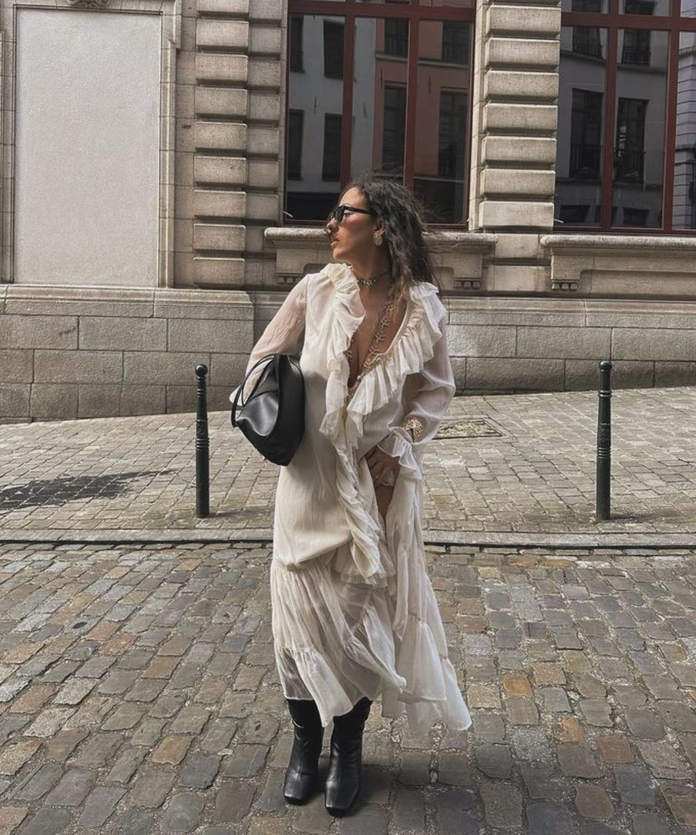 Mas a febre vai além das grifes de luxo—basta olhar os números: as buscas por referências boho aumentaram 755% no Pinterest, e os vídeos de arrume-se comigo no TikTok estão repletos de looks com franjas, rendas e modelagens fluidas.