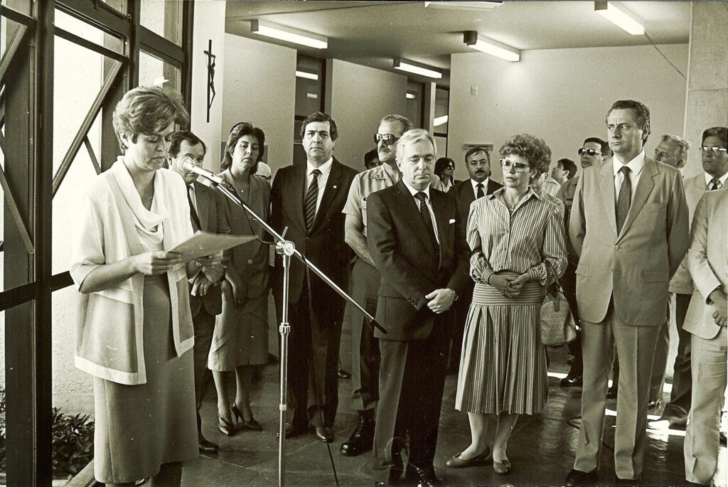 Diante de autoridades, entre elas o prefeito Magalhães Teixeira, Dra Silvia Brandalise discursa em evento em 1986