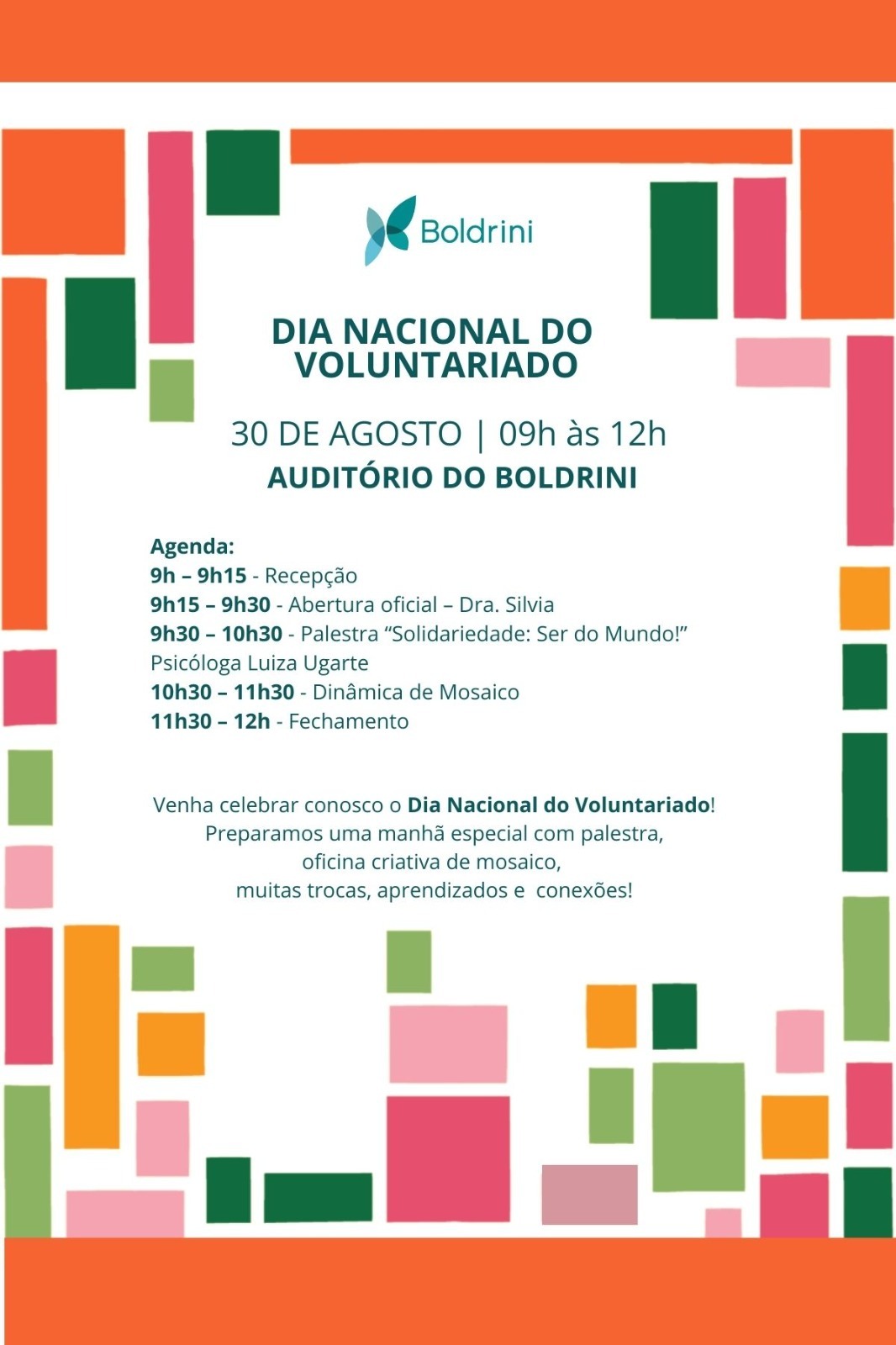 Para marcar o Dia Nacional do Voluntariado, celebrado na última quinta-feira (28), o Centro Infantil Boldrini promove em seu auditório (Rua Dr. Gabriel Porto, 1270 – Cidade Universitária, Campinas), na manhã deste sábado (30)  um evento das 9h às 12h com palestra e oficina criativa.