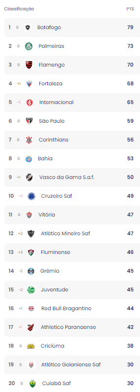 Na parte de baixo, o Athletico foi o último rebaixado, se juntando a Criciúma, Cuiabá e Atlético-GO. Além do Red Bull Bragantino, Atlético-MG e Fluminense se livraram da queda.