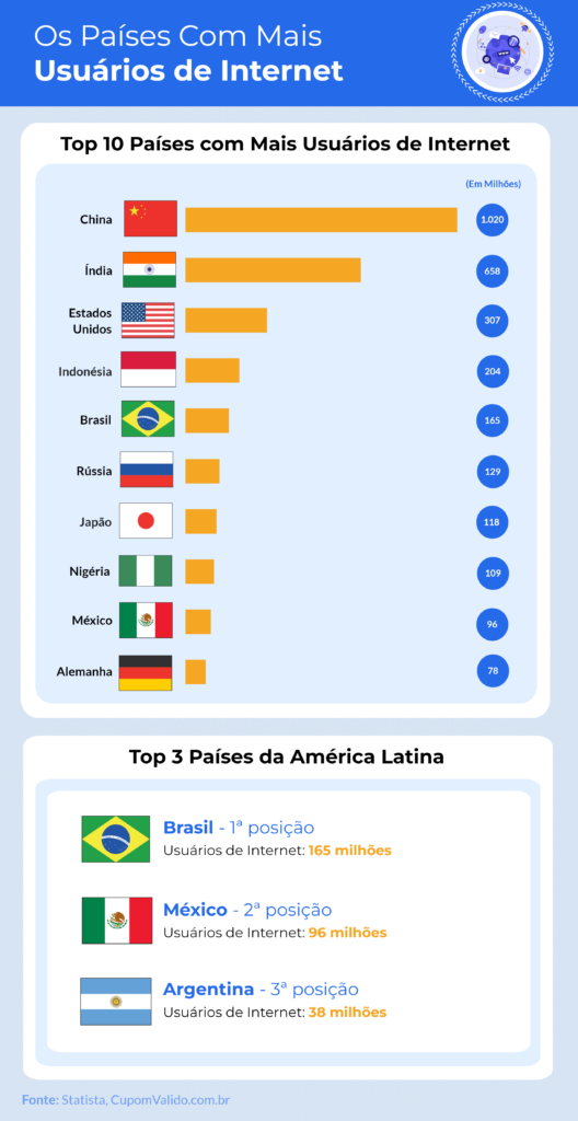 Com mais de 165 milhões de usuários, o Brasil se encontra na 5ª posição do ranking mundial dos países com a maior quantidade de usuários de internet. O país fica atrás somente da China (1 bilhão), Índia (658 milhões), Estados Unidos (307 milhões) e Indonésia (204 milhões). No total, são mais de 5 bilhões de usuários de internet ativo pelo mundo. É o que revela um estudo divulgado pela plataforma de desconto CupomValido.com.br com dados da Statista sobre os usuários de internet no mundo.