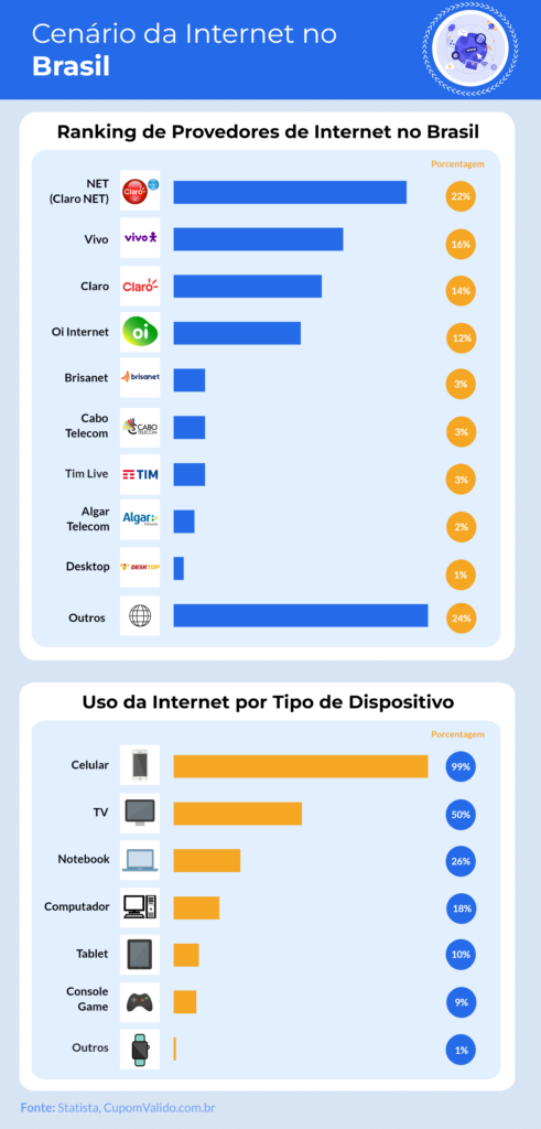 A NET (Claro NET) é o provedor de internet mais usados pelos brasileiros, com 22%. A Vivo está em segunda posição, com 16%. E a Claro em terceira com 14%. Em seguida fica a Oi, com 12%. A Brisanet, Cabo Telecom e Tim Live, possuem 3% de participação de mercado cada.
