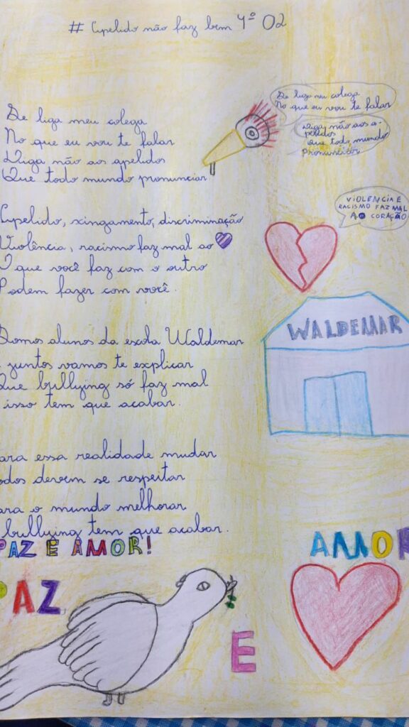 Nas etapas seguintes, eles trabalham com textos sobre o bullying e começam a propor soluções para enfrentar esse problema. Nessa etapa, as crianças também elaboram textos informativos para conscientizar a comunidade escolar sobre o bullying.