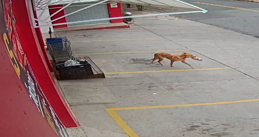A gerente resolveu checar as imagens de segurança para ver exatamente como o cachorro agia. As imagens mostram Caramelo entrando no mercado, pegando o pacote de pães de uma prateleira baixa e saindo com pressa.