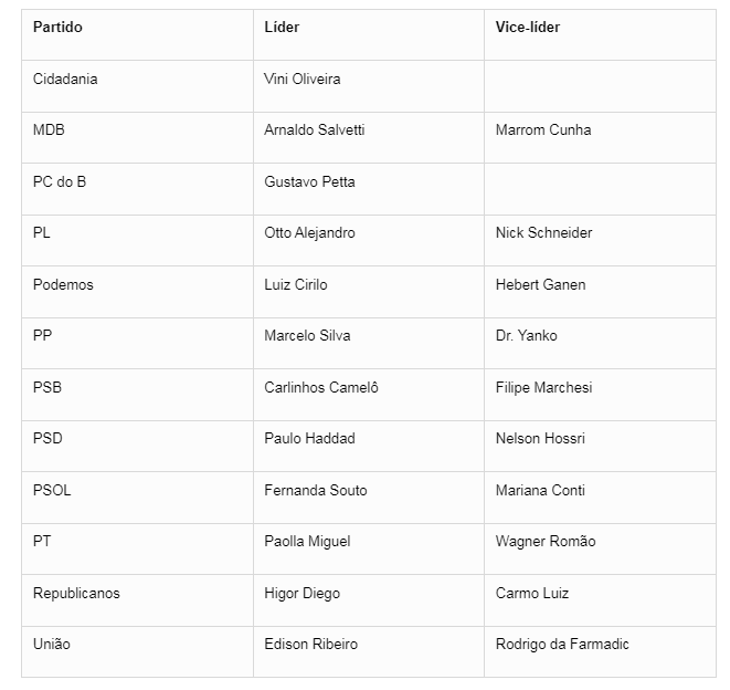 Se quiser, ele também pode ceder este tempo, integral ou parcialmente, a outro vereador filiado ao partido. As dez bancadas que tem mais de um representante eleito para a Legislatura 2025-2028 também indicaram os nomes dos vice-líderes, que substituem o líder em caso de ausência.