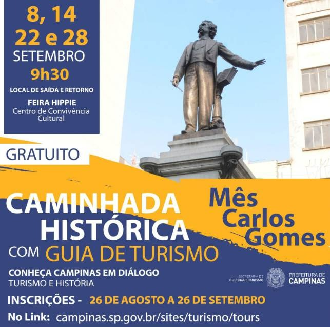 Este mês de setembro, celebrado como Mês Carlos Gomes, terá Caminhada Histórica com a temática em homenagem ao compositor campineiro. As caminhadas são gratuitas e estão marcadas para os dias 8, 14, 22, sempre às 9h30, com o acompanhamento do guia turístico Rafael Constâncio.
