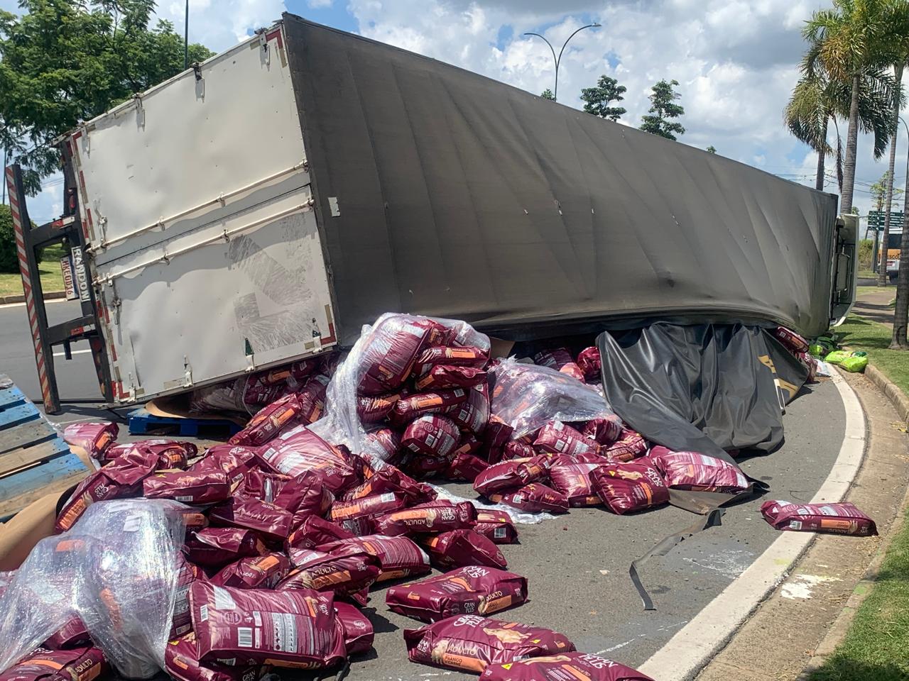 Um caminhão que levava 25 toneladas de ração tombou nesta sexta-feira (28) na rotatória que leva ao Swiss Park, em Campinas. O acidente ocorreu na Avenida Dermival Bernardes Siqueira, próximo ao cruzamento com a Avenida Antônio Artioli, sentido Centro. Não houve vítimas.