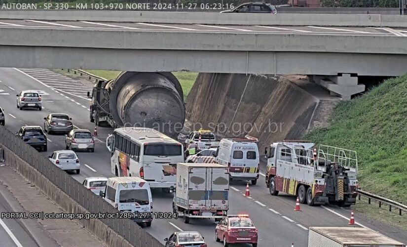 A colisão da carga de uma carreta em um viaduto na Rodovia Anhanguera (SP-330) na manhã desta quarta-feira (27) provocou lentidão de, aproximadamente, 13km em trecho no sentido capital. O acidente aconteceu no km 103.