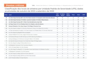 A Emdec também listou os trechos com maior índice de severidade de acidentes, com base na Unidade Padrão de Severidade (UPS), que pondera o número de ocorrências sem vítimas, com feridos, atropelamentos e mortes, entre outubro de 2022 e setembro de 2025.