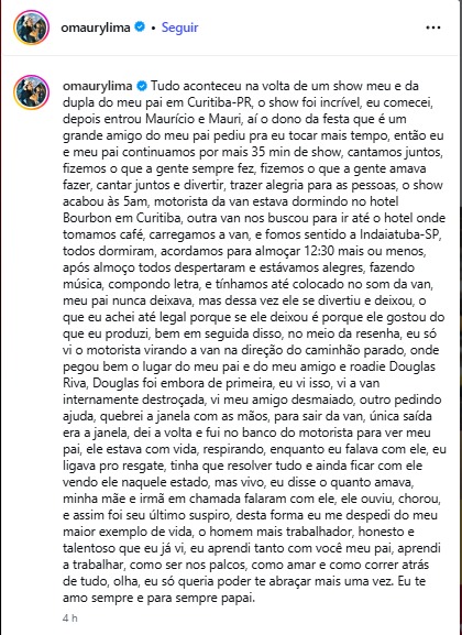 “Enquanto eu falava com ele, eu ligava pro resgate, tinha que resolver tudo e ainda ficar com ele vendo ele naquele estado, mas vivo, eu disse o quanto amava, minha mãe e irmã em chamada falaram com ele, ele ouviu, chorou, e assim foi seu último suspiro. Desta forma, eu me despedi do meu maior exemplo de vida, o homem mais trabalhador, honesto e talentoso que eu já vi”, escreveu Maury.