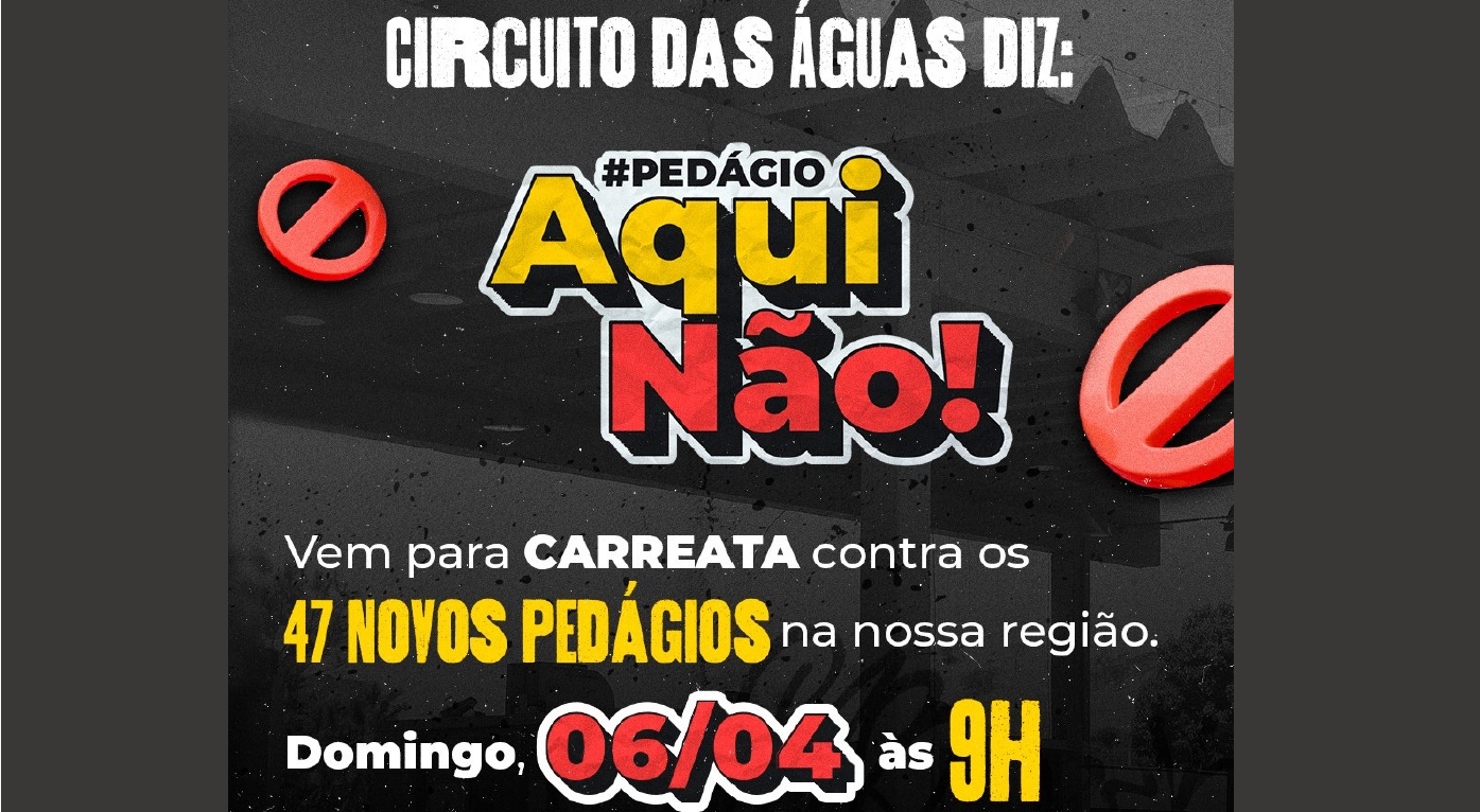 Integrantes do movimento “Pedágio aqui não!” agendaram para este domingo (6) múltiplas carreatas, que sairão das cidades do Circuito das Águas em direção a Amparo, a partir das 9h. Os manifestantes vão protestar contra a medida do governo de São Paulo, que pretende implantar 47 novos pórticos de pedágio, no sistema Free Flow, em rodovias estaduais da região.