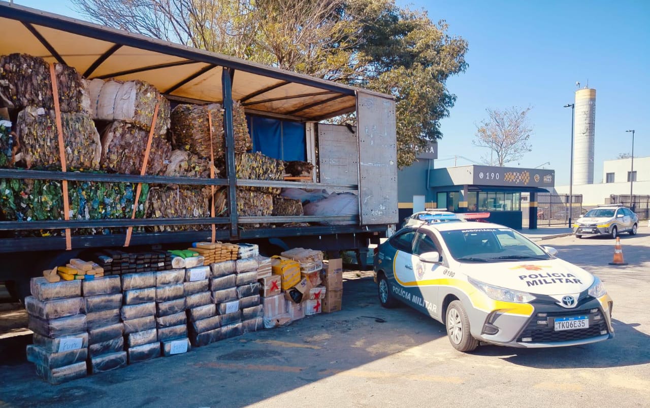 Durante as buscas, os policiais conseguiram encontrar o veículo na rodovia Santos Dumont. Na carroceria da carreta, havia sucata com garrafas pet. Em meio aos produtos, os agentes descobriram a carga de maconha e outros 11 quilos de skunk.