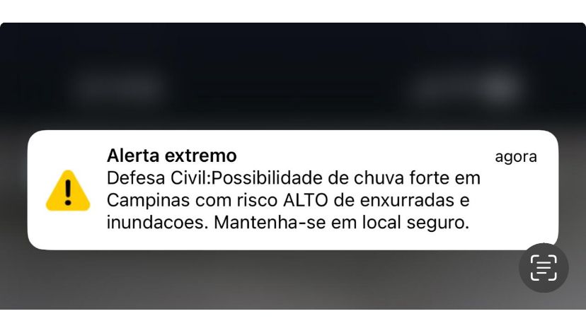 O texto da mensagem foi o seguinte: “Alerta Extremo – Defesa Civil: Possibilidade de chuva forte em Campinas com risco ALTO de enxurradas e inundações. Mantenha-se em local seguro.