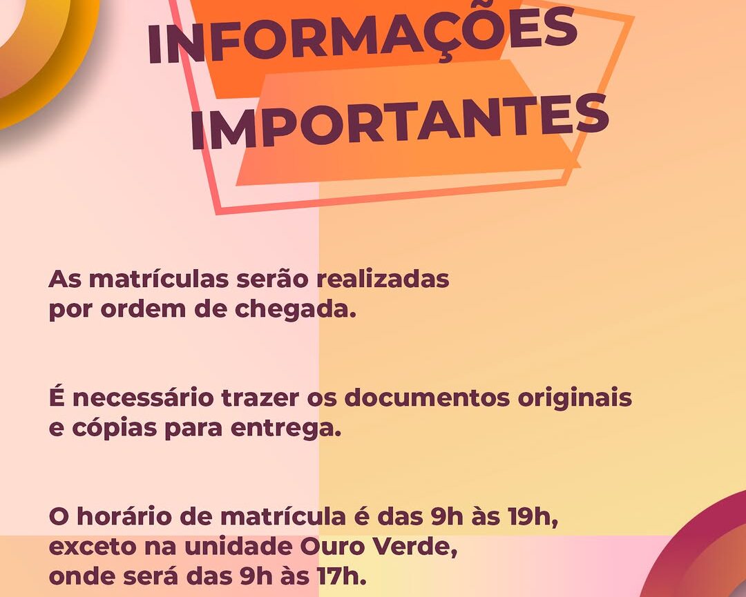 As inscrições devem ser feitas diretamente nas unidades onde o candidato deseja estudar, onde deverão ser apresentados as cópias e documentos originais do RG com CPF, comprovante de escolaridade, comprovante de endereço e foto 3×4 recente.