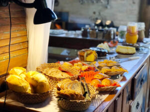 Ao acordar, os hóspedes têm à disposição pães variados, bolos, cereais, doces, geleias, pães de queijos, pamonhas, wafer, ovos mexidos e frutas,