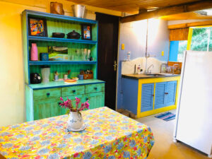 O chalé é totalmente revestido em madeira (pisos, paredes, teto, janelas), assim como alguns móveis, como o armário, a mesa e o gabinete cozinha, o que confere charme bucólico todo especial ao espaço.