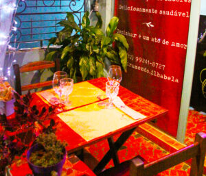 Uma das mesinhas, postada na varanda da casa, é a mais disputada por casais, pois está em um cantinho romantizado pelo bistrô.
