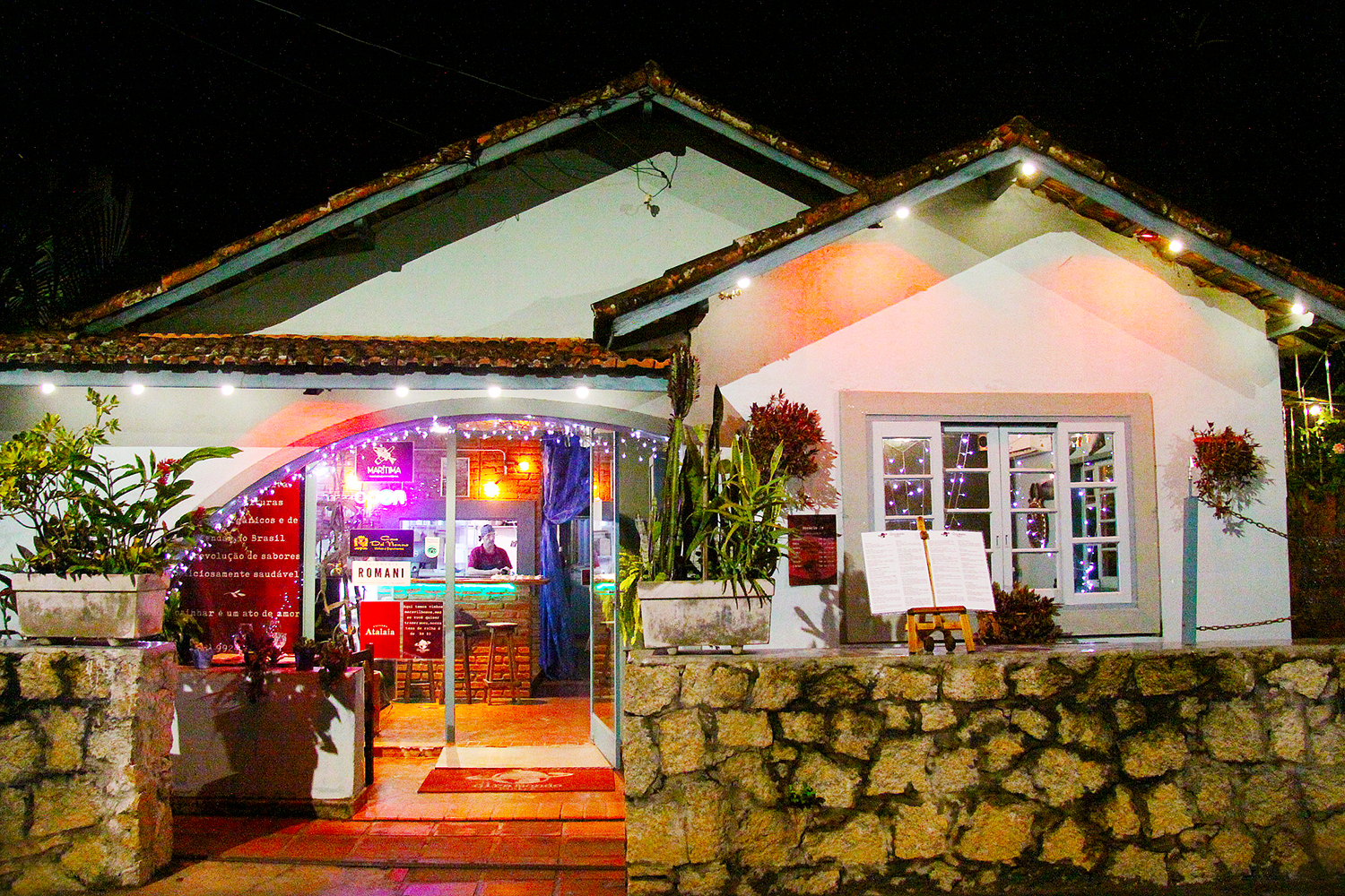 As taças de vinho sobre a mesa, as luzinhas de led no entorno do espaço, tornando-o bem charmoso; as plantas típicas da Mata Atlântica quase se debruçando sobre a mesas e a privacidade, são um convite irresistível aos casais apaixonados.