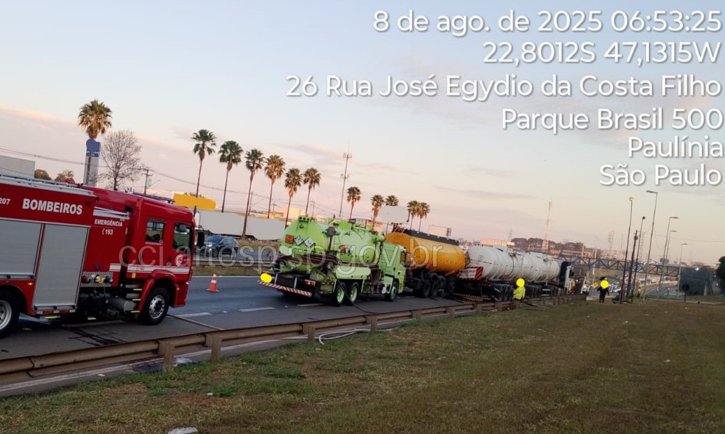 Uma colisão entre duas carretas provocou o vazamento de 32 toneladas de diesel e bloqueios parciais na Rodovia Professor Zeferino Vaz (SP-332), em Paulínia, na madrugada desta sexta-feira (8). O acidente ocorreu por volta das 2h06, no km 121, sentido Norte. Nenhum dos motoristas ficou ferido.