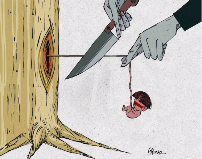 Uma faca em mãos anônimas, possivelmente de uma pessoa de terno, corta o cordão umbilical que une uma árvore a um bebê indígena recém-nascido. O cartum com imagem chocante, de autoria de Gilmar Machado, venceu o Grande Prêmio – Troféu Zélio de Ouro, do 51º Salão Internacional de Humor de Piracicaba. O artista gráfico, conhecido como Gilmar, um baiano radicado em São Paulo, também ganhou a categoria Cartum com a mesma obra.