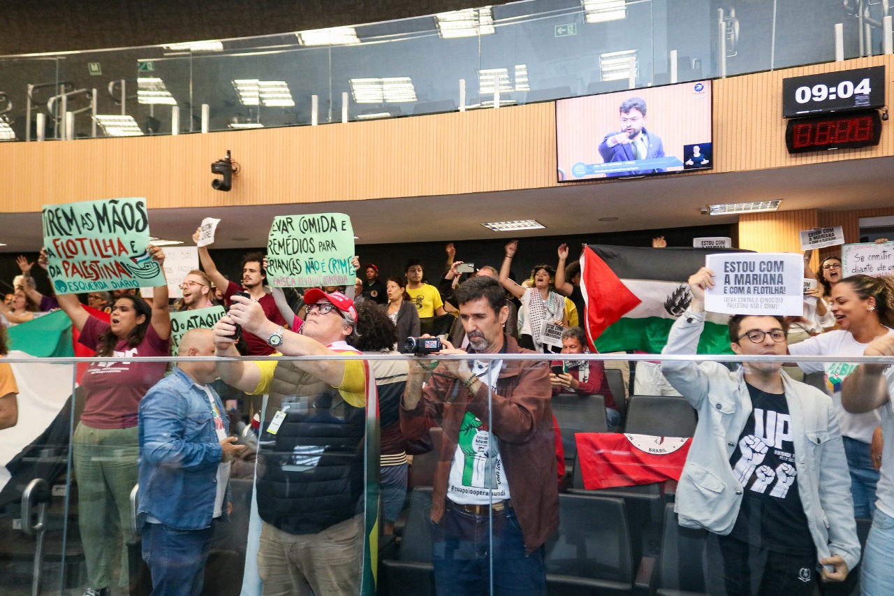 Os ativistas foram ao Legislativo para pressionar a Casa a não abrir a Comissão Processante (CP) contra a parlamentar, que participou recentemente de uma ação humanitária de tentativa de levar suprimentos para a Faixa de Gaza e acabou presa por militares israelenses.