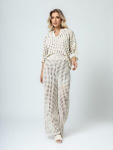 Mas a Tramar vai além da beleza estética. “A escolha de fios especiais, como a viscose, que é feita a partir de fibras naturais, garante uma textura suave e um caimento fluido, perfeito para os dias mais quentes”, explica Fabiana. Outro destaque é o fredo, um fio macio que oferece uma sensação de conforto extremo. E não podemos esquecer o modal, que mantém a suavidade e o caimento leve, tornando essas peças ideais para o verão.