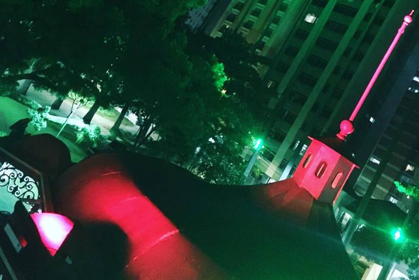 O coreto da Praça Carlos Gomes em tons de vermelho, com o entorno iluminado Foto: Firmino Piton/PMC/Divulgação