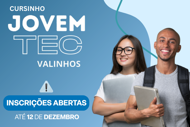 O Cursinho Preparatório Pré-Vestibulinho JovemTec, mantido pelo Círculo de Amigos do Patrulheiro de Valinhos, está com inscrições abertas para a sua 4ª edição, que ocorrerá de fevereiro a novembro de 2026. As inscrições, gratuitas, podem ser realizadas até 12 de dezembro, via formulário online, e as aulas serão ministradas de segunda a sexta-feira, no período noturno, no Residencial São Luiz.
