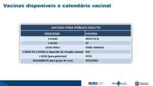 De acordo com a coordenadora do Programa Municipal de Imunização, Chaúla Vizelli, também é importante que os adultos fiquem atentos às doses voltadas para os maiores de 18 anos. São seis diferentes imunizantes destinados a esse grupo.