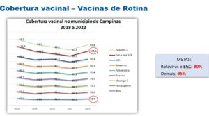 No ano passado, apenas duas das principais vacinas de rotina – tetra viral SCR e BCG –  atingiram as metas de cobertura de 95% e 90%, respectivamente, em Campinas. A cobertura mais baixa foi a do Rotavírus (86,3), seguida pela da pólio (89,4). Em 2022, as coberturas ficaram entre 85,8% (hepatite A) e 108,6% (tetra viral SCR).
