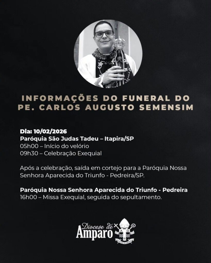 “Com profunda dor, mas sustentados pela esperança cristã, comunicamos o falecimento do Pe. Carlos Augusto Semensim, sacerdote que dedicou sua vida ao serviço do Evangelho, da Igreja e do povo de Deus, na diocese de Amparo-SP. Após um período de enfermidade e cuidados intensivos, o Pe. Carlos foi chamado à Casa do Pai, onde confiamos que é acolhido pela misericórdia infinita daquele a quem serviu com fidelidade ao longo de seu ministério presbiteral”, diz trecho de comunicado da Diocese de Amparo.