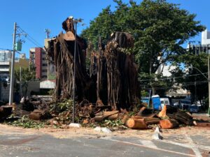 A operação de extração envolveu dezenas de trabalhadores e vários caminhões. Os gigantescos troncos da falsa-seringueira recém cortados mostravam que a árvores estava saudável até o incêndio. Pessoas paravam na região para fotografar a extração e lamentavam o fim de uma referência da área.