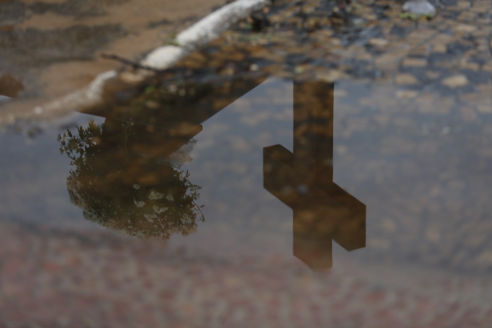 Poça d'água reflete imagem da cruz em cemitério - Fotos: Leandro Ferreira\Hora Campinas
