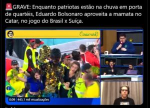 “Eduardo Bolsonaro e sua conje são flagrados no Catar curtindo jogo na copa, enquanto os patriotas estão na porta dos quartéis debaixo de chuva, sol, insolação e leptospirose”, traz umpost no Twitter com a imagem de alegria de Eduardo Bolsonaro. “Mentira que os patriotas estão tomando sol e chuva e Bolsonaro tá no catar vendo jogo da Copa”.