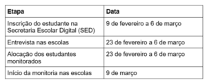 • monitor matriculado na 1ª série: pode atender classes dos 6º e 9º anos do Fundamental e da 1ª série do Médio