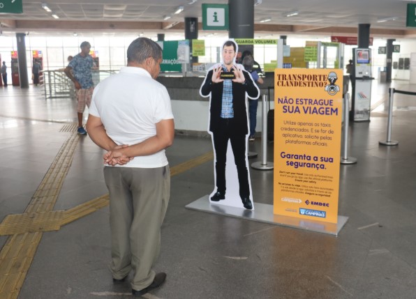 A campanha inclui a instalação de painéis educativos e de alerta em português, inglês e espanhol, simulando situações em que passageiros são abordados por motoristas clandestinos. O objetivo é conscientizar sobre os riscos e reforçar a recomendação de uso apenas de táxis credenciados ou plataformas oficiais de transporte por aplicativo.