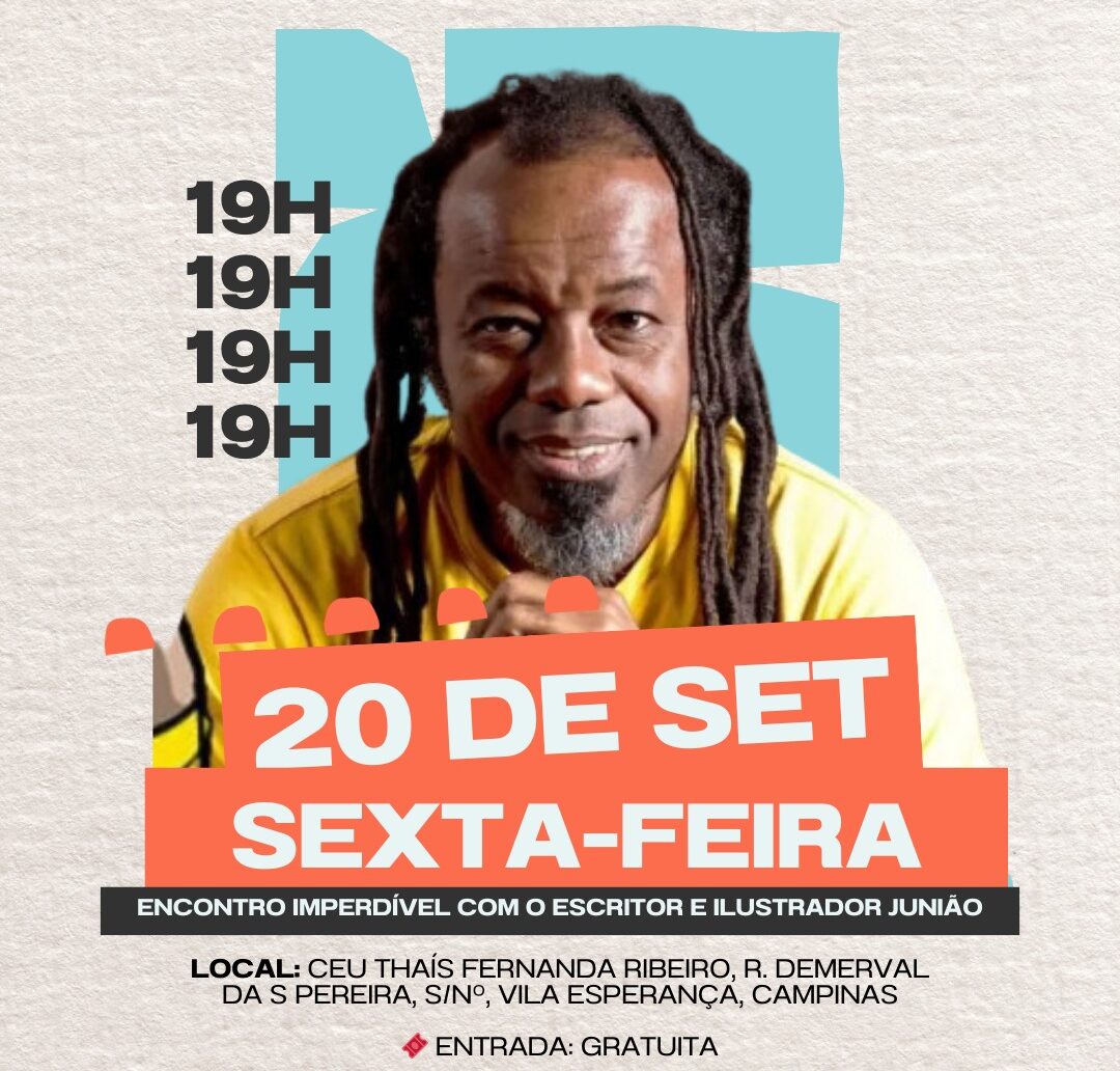 O escritor e ilustrador Junião, autor do livro “Meu Pai Vai Me Buscar na Escola”, realizará uma palestra nesta sexta-feira (20), às 19h, no CEU Thaís Fernanda Ribeiro, com entrada gratuita. O evento visa compartilhar a trajetória pessoal e profissional, além de discutir a criação de sua obra, que foi motivada pela busca de representatividade para seu filho. Trata-se de um projeto contemplado pela Lei Paulo Gustavo, por meio da Secretaria Municipal de Cultura e Turismo.