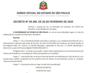 O governador de São Paulo Tarcísio de Freitas (Republicanos) oficializou, por meio de decreto publicado nesta quarta-feira (26), a cessão do Palácio da Justiça, no Centro de Campinas, para abrigar a Câmara de Vereadores e o Museu do Judiciário no município. A decisão foi tomada com base na deliberação do Conselho do Patrimônio Imobiliário.