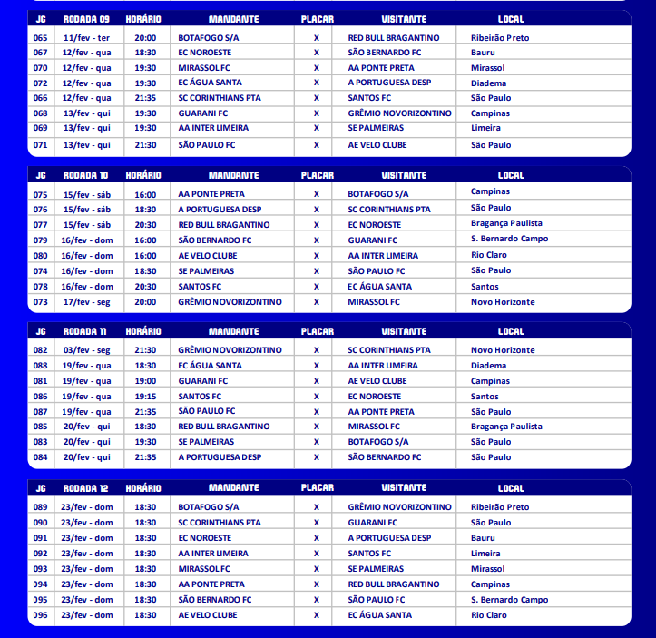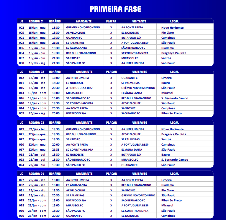 A Ponte Preta estreia no dia 15 de janeiro, em Novo Horizonte, às 18h30, contra o Novorizontino. Já o Guarani faz seu primeiro jogo na competição em casa, no mesmo dia, uma quarta-feira, às 19h30, contra o Botafogo.
