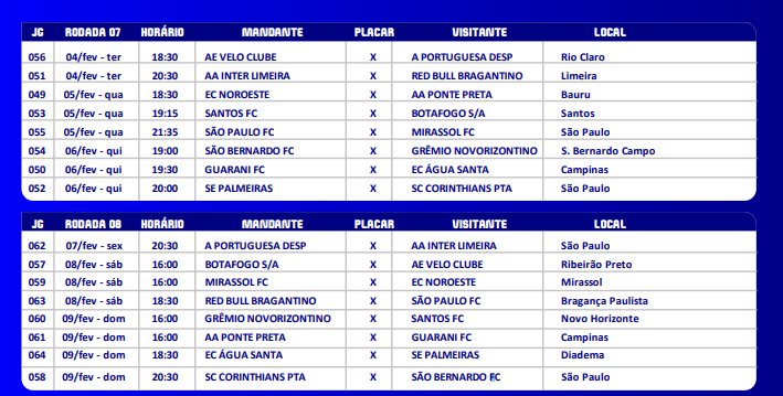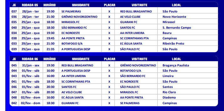 Na segunda rodada, a Ponte recebe o Santos no Majestoso, um domingo, dia 19, às 20h30. O Guarani terá sua segunda partida contra a Inter de Limeira, em duelo regional, no sábado, 18 de janeiro, às 16h.