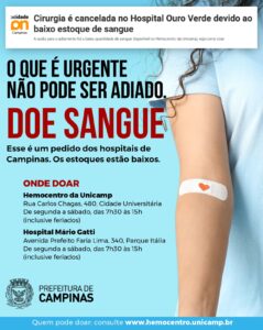 Alguns tipos sanguíneos estão em situação crítica desde a semana passada, com estoque para menos de um dia, e ainda há riscos de cancelamento de cirurgias eletivas por conta da falta de sangue.