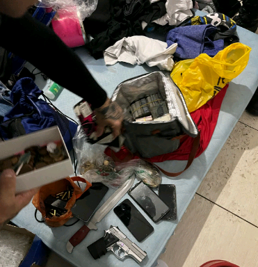 Durante a abordagem, os guardas encontraram uma mulher e uma criança no local, no segundo andar de um imóvel na Rua Francisco Teodoro. Em um dos quartos, foram apreendidos um revólver calibre .380, mais de 1,5 mil porções de crack, cocaína e maconha, além de uma balança de precisão, um drone, 13 celulares e uma quantia significativa de dinheiro em espécie, parte em notas falsas.