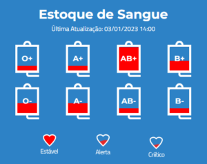 Dos oito tipos de sangue disponibilizados pelo Hemocentro, quatro estão em nível crítico: O+, A+, AB- e B-.  Os tipos B+, O- e A- estão em estado de alerta. Somente o tipo AB+ está estável.