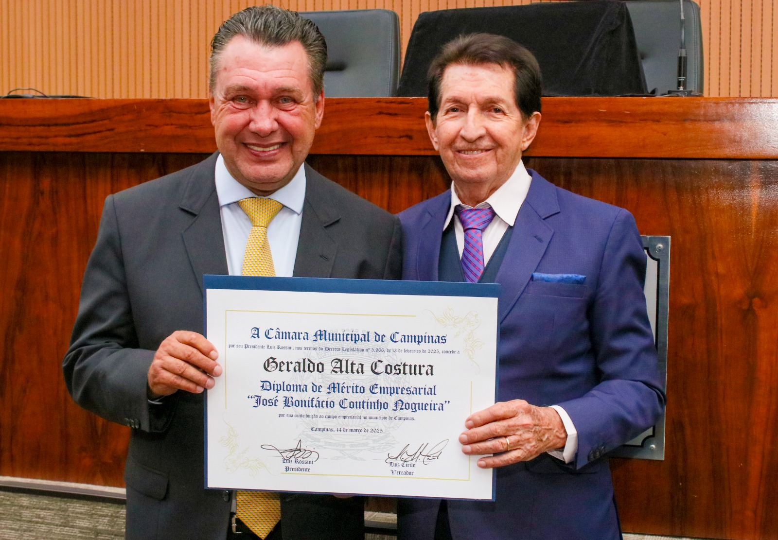 A Câmara Municipal de Campinas concedeu na noite de sexta-feira (14) ao ateliê Geraldo Alta Costura o Diploma de Mérito Empresarial “José Bonifácio Coutinho Nogueira”. A honraria foi entregue a Geraldo Barbosa, conhecido alfaiate pela trajetória de sucesso e por manter a tradição de vestir os prefeitos de Campinas.