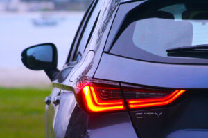 A traseira da versão 2024 do sedã médio EXL (modelo intermediário que fica abaixo da Touring e acima da EX), testado pela reportagem, chegou com uma nova roupagem e uma mudança significativa nas lanternas, em led, mais modernas, contrapondo o estilo quadradão das primeiras versões.