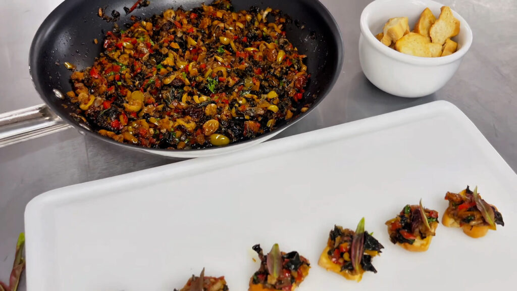 Adicionar os pimentões, azeitonas e as uvas-passas misturando bem. Juntar o restante dos ingredientes e deixar apurar em fogo baixo até secar. Finalizar com um fio generoso de azeite e servir com torradas.